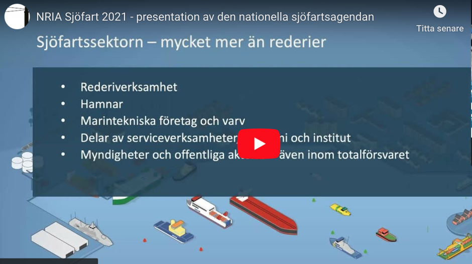 NRIA Sjöfart 2021 handlar om framtiden för en näring som omsätter 85 miljarder kronor om året och som sysselsätter 100 000 svenskar inom rederier, marintekniska företag, hamnar, myndigheter och akademi. Om vi vill att sjöfartssektorn ska bli hållbar och fortsätta trygga landets försörjning och ge rätt förutsättningar för exportindustrin – då måste vi satsa betydligt mer på sjöfartsforskning och innovation (FoI). Detta webinar som hölls den 14 april 2021 förklarar varför.