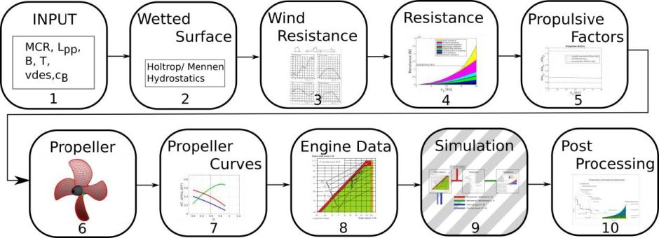 I modellen har ett starkt fokus lagts på skeppets hydrodynamik och hur framdrivningssystemet beter sig i olika havs- och väderförhållanden. Modellen är utformad från skeppsbyggarens synvinkel med målet att ge tillförlitliga förutsägelser om energieffektivitet under design och drift av fartyg.