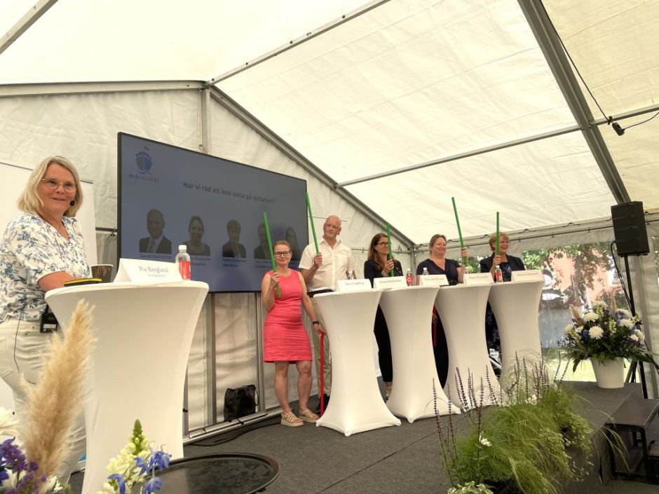 Grön pinne för ja, röd pinne för nej. Alla politiker i panelen vill ha fler fartyg med svensk flagg. Till vänster moderator ...